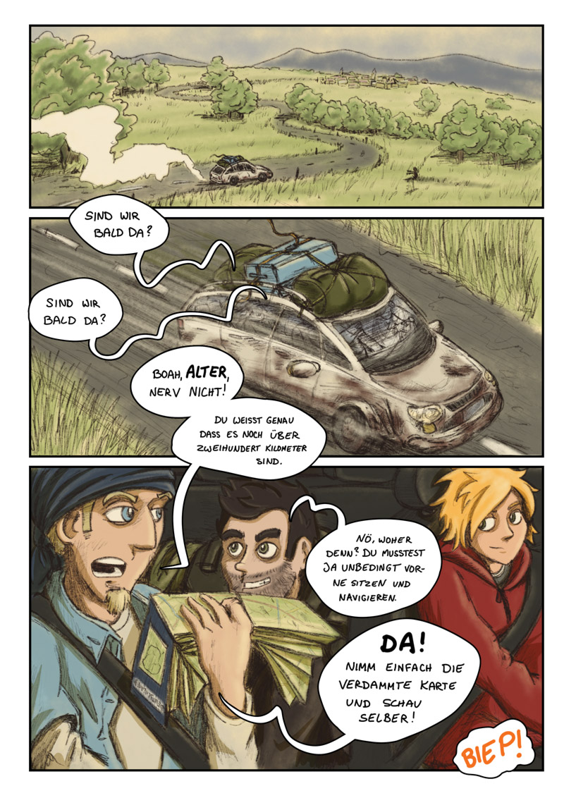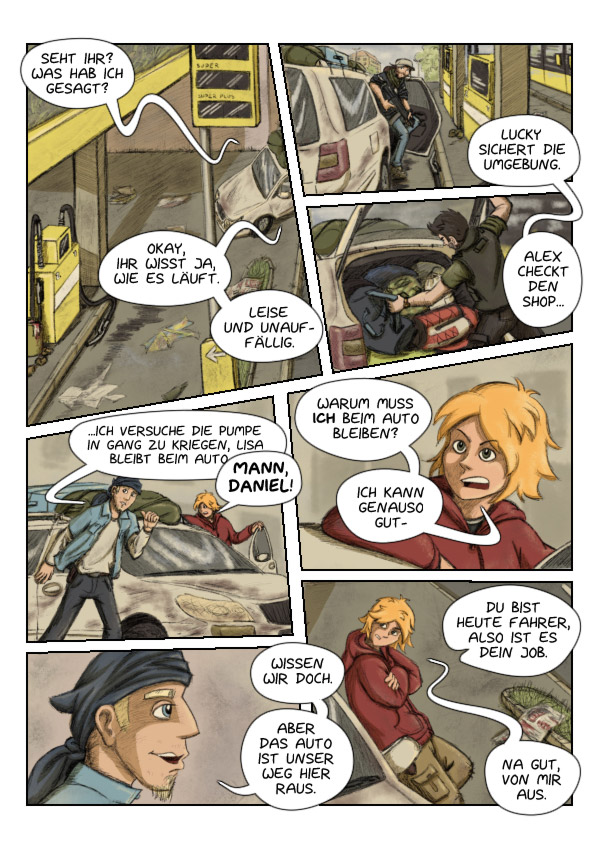 Die Colorierung gefällt mir, das Lettering ist so in Ordnung. Daß diese Welt "kaputter, düsterer und dreckiger" ist als unsere, kommt nicht so rüber, aber muß ja auch nicht sein. Der Zeichenstil ist Dein Stil (würde ich sagen, nachdem ich schon länger nichts mehr von Dir gesehen habe), und da würde ich auch nicht mit Gewalt etwas dran ändern.Benutzer, die sich für diesen Beitrag bedankt haben: