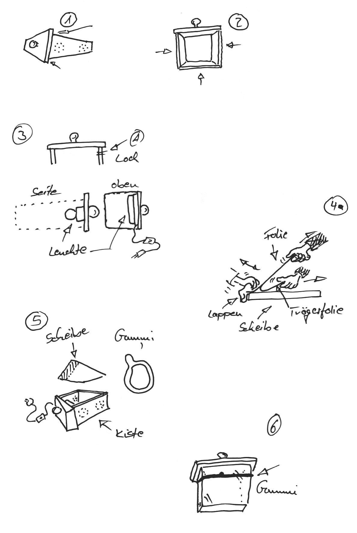 Als erstes sucht Ihr Euch eine alte, aber (weitgehend) intakte Holzschublade in einer Größe, die auf Euren Schreibtisch passt und trotzdem groß genug ist, dass ein Blatt Papier der Größe DIN A 4, zwischen den Rändern soviel Platz hat, dass man es mit Klebestreifen (wie Tesa) an der Scheibe festkleben kann . Die kann man auch ganz gut auf dem Sperrmüll finden. Ganz egal, wie die aussieht, malt sie im Zweifel einfach nach Euren Vorstellungen an. Von innen bekommt sie einen weißen Anstrich, falls sie nicht schon weiß ist. Bohrt jetzt gleich schon mal ein paar (ruhig ein paar mehr) Lüftungslöcher in die Seitenwände. Wer mag, kann jetzt den Boden mit Alufolie auslegen (festkleben nicht vergessen).