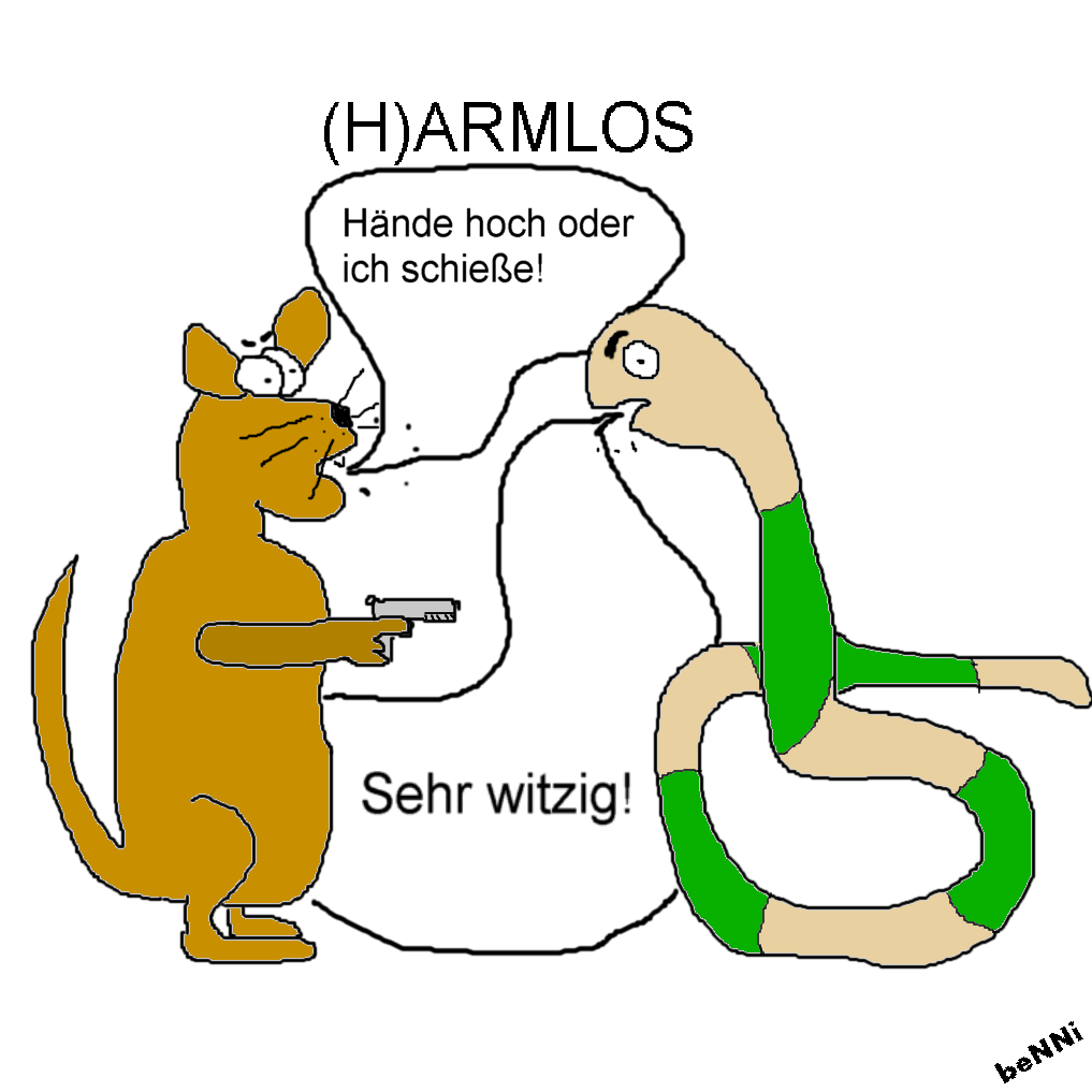 Hände hoch find ich witzig, hätte mir nur irgendwie einen viel empörteren Blick von der Schlange gewünscht :-). Colorierung ist da nicht ganz so sauber, aber das weisst du eh :-)