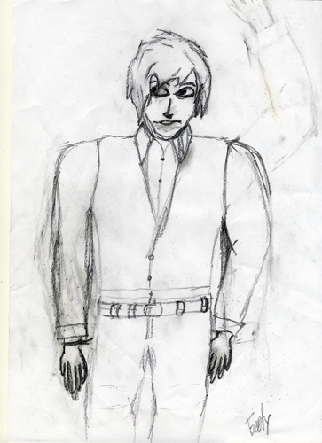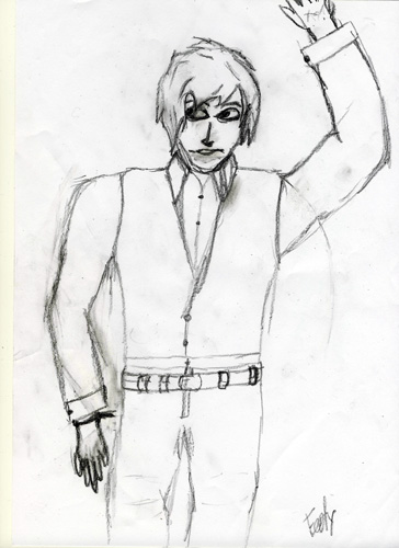 Am Anfang würde ich ihn jetzt vielleicht erstmal zeichnen, wenn er beide Arme unten hat. Der Abstand zwischen Arm und Körper ist auch etwas zu groß. Im gesammten vielleicht alles etwas lockerer zeichnen und nicht zu eckig. :) ;)