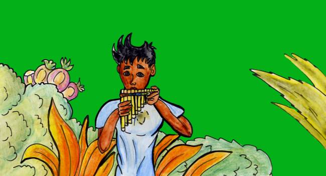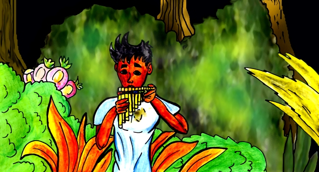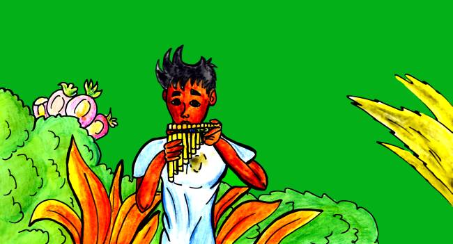 Nun habe ich, da mit Aqurellstiften die Farben doch recht blass sind, gerade bei den Büschen, mit Kontrast und Heligkeit gespielt. Dabeit habe ich einige Bildteile, wie die Haare des Indios nicht verändert, bei den Büschen jedoch, zusätzlich zur Kontrastveränderung, mit dem Farbtopf (65 % Transparenz der Farbe, dunkles grün) gefüllt