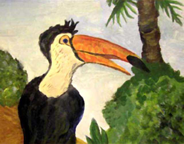 Jetzt ist das Bild fertig! :D Mittels zur Hilfenahme eines Aquarells namens DER SCHWARZE TUKAN (seihe Bild 2) gestalltete ich den Hintergrund am Computer. Ich verwendete den Pinsel, Aufhellungs- und Abdunkelungstools, die Verwischtechnik und Musterfüllung, mit der ich erst den Hintergrund auffüllte ihn aber dann noch im Bild bearbeitete. :)