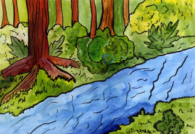 Hier ist meine erste Acryl-Zeichnung vor ca. 1,5 Jahren im Comickurs gemallt, den Umriss habe ich später dazugefügt. Ich liebe es, Landschaften, vor allem Natur zu zeichnen und zu malen. Was haltet ihr davon, ich finde für's erste doch gar nicht schlecht, oder? Es ist übrigens auf einem normalen DIN A4-Karton gezeichnet.