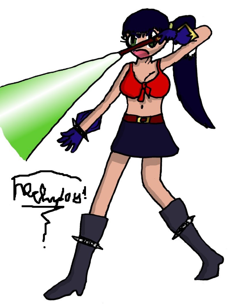 Das Dings an ihrer (von uns) rechter Hüfte ist eine Elektro-Draht-Pistole. Die Hände hat sie hinter dem Körper. Wie findet ihr sie?