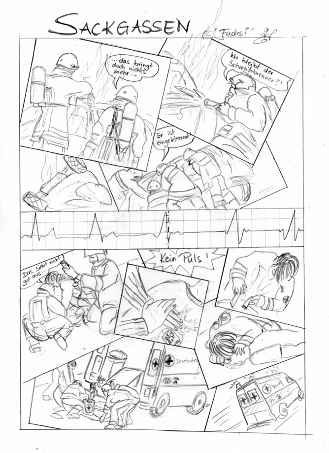 Erstmal gibt es aber die 1. Seite nochmal reloaded - mit neuem EKG und im oberen Bild hab ich dem Sanitäter eine Defi in die Hände gezeichnet, das passt mir irgendwie besser in die Kontinuität.