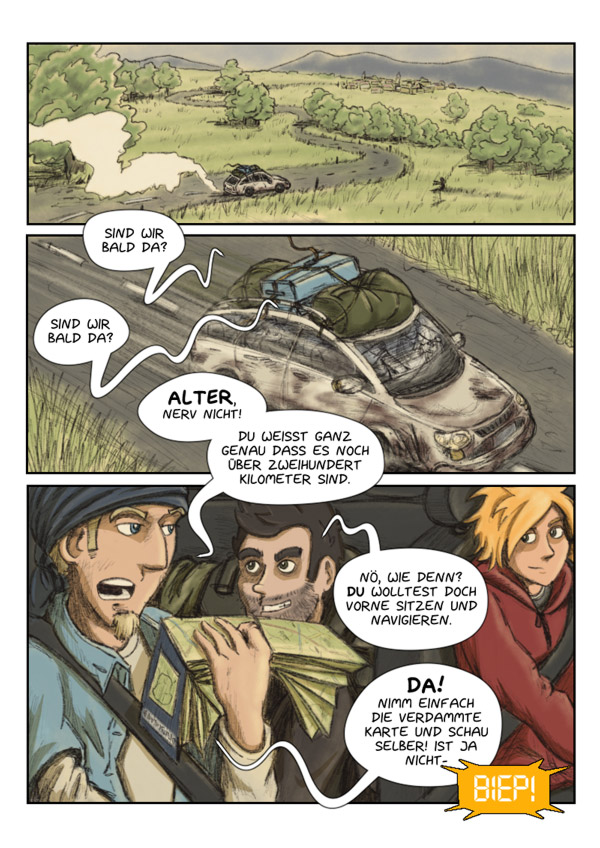 Die Colorierung gefällt mir, das Lettering ist so in Ordnung. Daß diese Welt "kaputter, düsterer und dreckiger" ist als unsere, kommt nicht so rüber, aber muß ja auch nicht sein. Der Zeichenstil ist Dein Stil (würde ich sagen, nachdem ich schon länger nichts mehr von Dir gesehen habe), und da würde ich auch nicht mit Gewalt etwas dran ändern.Benutzer, die sich für diesen Beitrag bedankt haben: