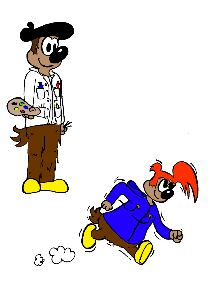 Gut finde ich erstmal die Farbgebung. Das ist so richtig Comic-Stil. Die beiden Gestalten gehören nach meinem Eindruck eher in die Kauka- als in die Disney-Richtung. An dem Maler gibt es eigentlich nichts auszusetzen; "Emilio" ist ein guter Name, ich finde auch, er müßte italienisch sein. Vielleicht auch "Luigi". Fussel wird in der Bewegung eingefangen, das könnte ich mir noch ein bißchen eleganter vorstellen. Aber auf jeden Fall sind beide Figuren ausdrucksvoll und ansprechend.
