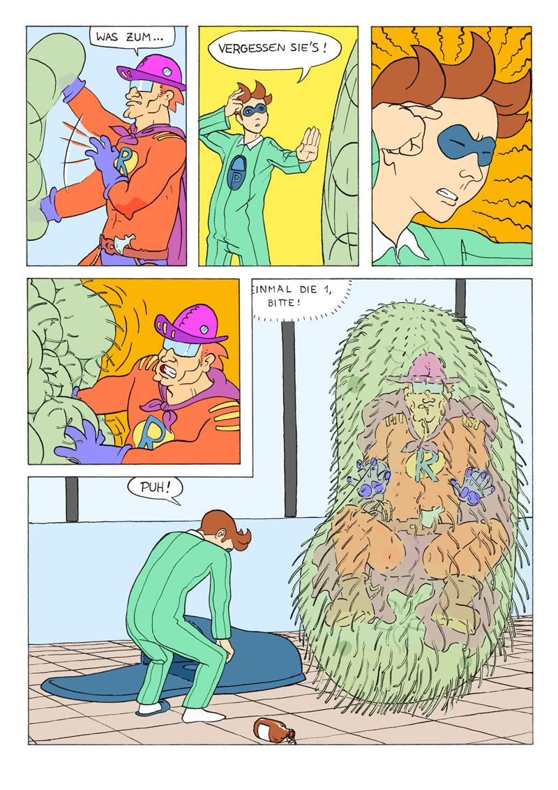 Aber bene hat auch großartig abgeliefert. Vom Aufwand her nehmen sich die beiden wohl nichts. Der Zeichenstil von bene ist etwas vereinnahmender als der von Qualle. Jedenfalls in diesem Comic.