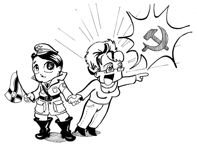 Ich muss nächste Woche einen Chibi-Comic nach fremdem Skript zeichnen, oha. Selbstredend übt man als verantwortungsbewusster Zeichner vorher mit irgendwelchen billigen Müllfiguren. Rechts im Bild ist Sarah Palin mit Blick auf Russland.