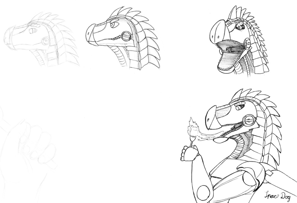 Das mit dem Vater sein, war eigendlich nur Spaß. In Wahrheit bin ich nur mega unkreativ, dass ist alles. :P Die sollten sich eigendlich gar nicht so änlich sehn und was die koloration angeht: Ich dachte ich lass ihn etwas schrottig aussehen. Also mit verschiedenn braun und orange Tönen. Ich trau mich nur nicht es zu inken, weil mir das in letzt Zeit immer häufiger misslingt und ich mir hier so viel Mühe gegeben habe. Und einen Leuchttisch hab ich nicht um es abzupausen und ich hab auch gar nicht den Platz für einen.