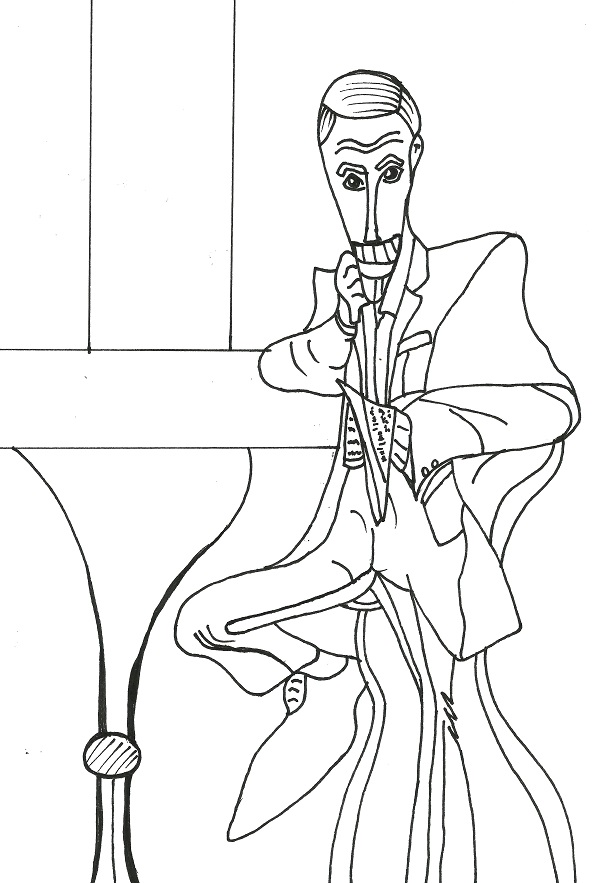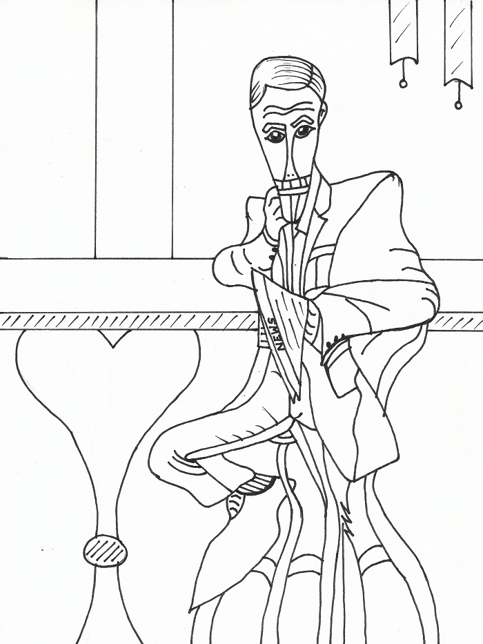 Diese im Kaffeehaus sitzende, zeitunglesende, kaffetrinkende Karikatur ist zeichnerisch noch nicht ganz ausgearbeitet.