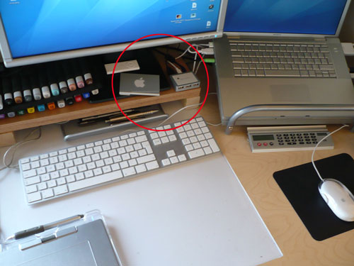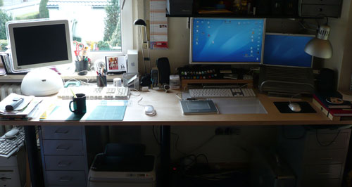 Man beachte bitte meinen in den Tisch integrierten Leuchttisch und das kleinste Macbook der Welt. (eigentlich nur eine Visitenkartenbox höhö) Nicht zu vergessen der 22" Monitor, der an dem Mac Book Pro (!) gekoppelt ist.