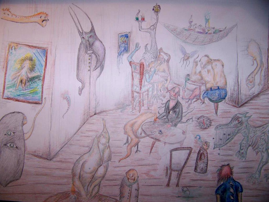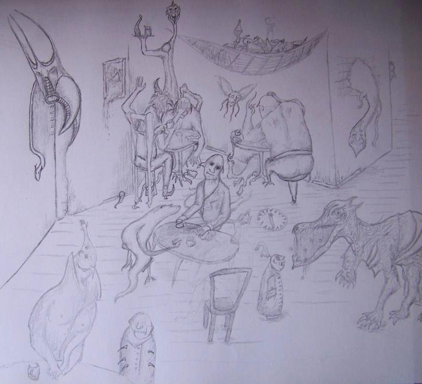 schon mal was von Alfred Kubin gehört?... dein Stil und der Inhalt des Bildes erinnern mich daran... hat aber auch Ähnlichkeiten zu Hieronymus Bosch