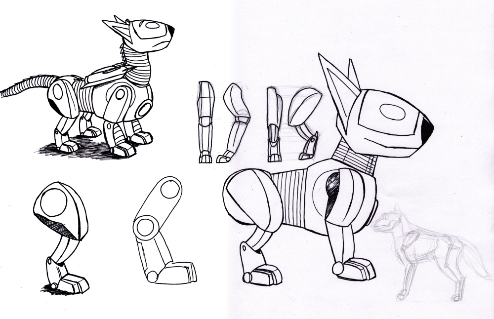 Deinen Wauwau halte ich für sehr gelungen. Was ich cool fände, wäre, wenn Du den Hals (wie auf einigen Studien zu erkennen) als eine Art "Faltenbalg" darstellen würdest. Du weißt schon, wie bei einem alten Fotoapparat. Das hätte für Dich den Vorteil, daß Du den Hals quasi "ausfahrbar" machen würdest, was in einem Hunde(maschinen)cartoon völlig neue Möglichkeiten schafft. Auch den Schwanz könnte man analog dazu teleskopierbar machen.