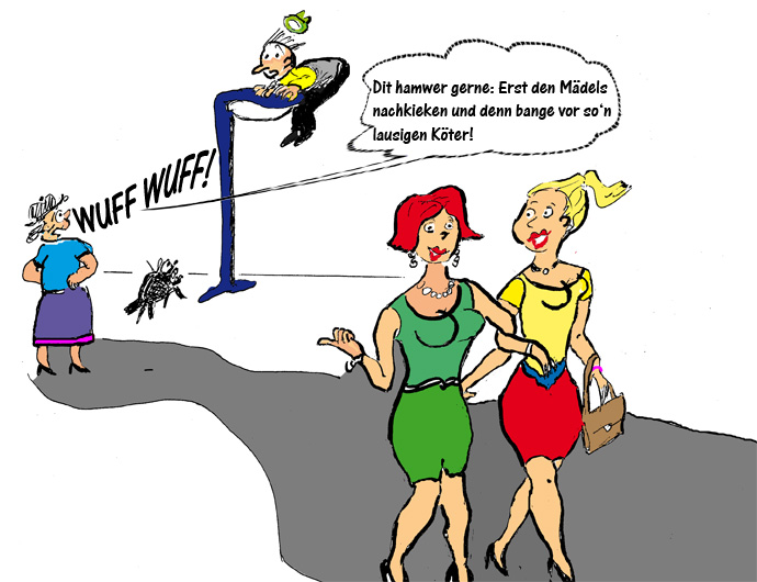 Der neue Cartoon ist schön - wird FrrFrr bestimmt auch gefallen :whistling: . Wenn ich ganz pingelig sein wollte, würde ich sagen: Die Frau ganz links verkompliziert die Geschichte ziemlich, die hätte ich vielleicht weggelassen. Vermutlich ist das die Ehefrau, oder? Das lenkt vom Gag ab, daß das Männchen sich erlaubt, in Anwesenheit seiner Gattin zwei jungen Damen nachzusehen. Und wie reagiert sie eigentlich? Sie stemmt die Arme in die Hüften, aber sonst sieht man nicht so viel von ihr. Fast scheint es, als würde sie bellen... Also besser wäre sie nicht im Bild - ohne sie funktioniert der Gag auf jeden Fall genauso, womöglich besser.