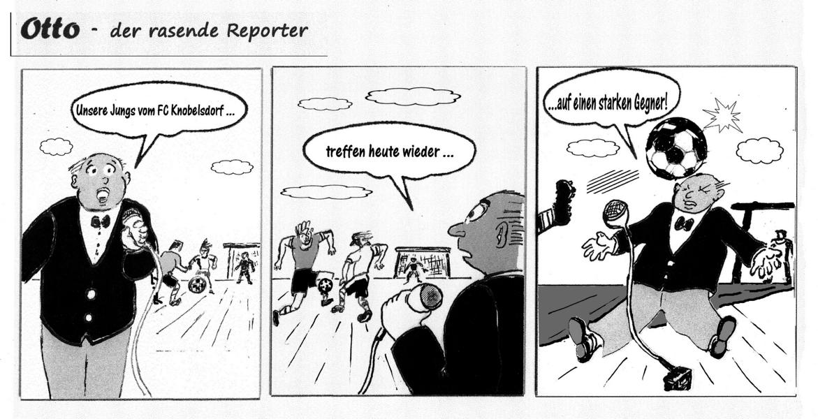 Der Reporter steht im letzten Bild mitten auf dem Spielfeld. Da muß er sich nicht wundern...