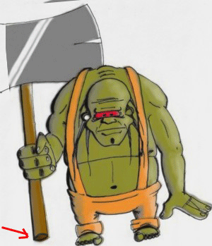 @Manga: voll doof... sagen wir einfach, die Klinge (wie heißt das bei ner axt?) istz soo breit, das der eine teil hinter seinem körper ist und der andere viel näher dran am betrachter...