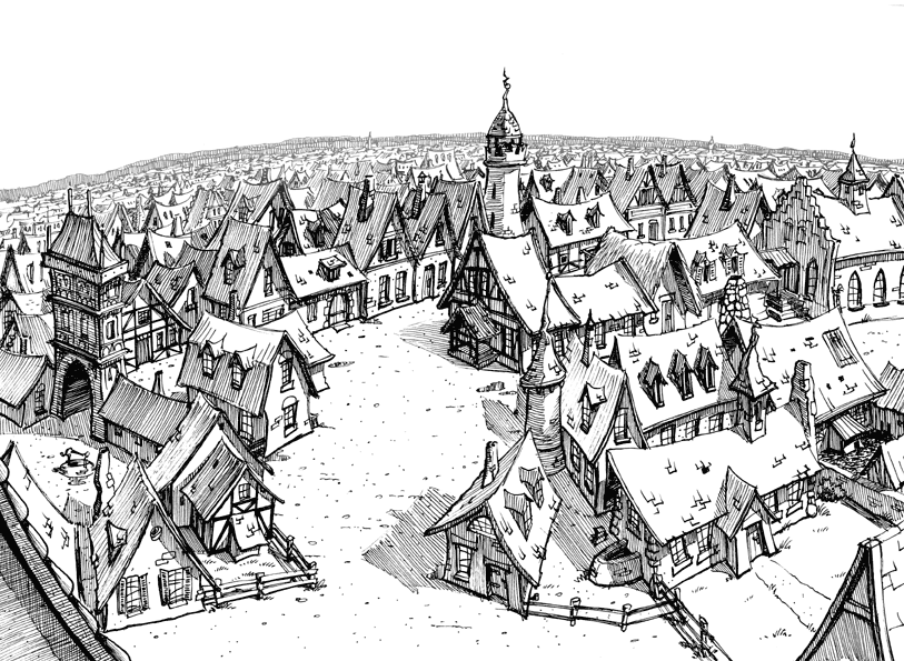 Hier mal was Neues. Zum Glück sind die Häuser alle schief, da fallen Fehler in der Perspektive gar nicht so auf.