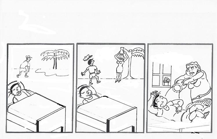 Als Vorschlag: Ich würde in den beiden ersten Panel den Traum in eine Traumblase setzen. So wird die kalte Wirklichkeit im 3. Panel noch deutlicher.