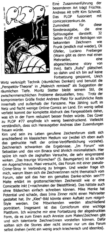 Man kann natürlich wieder mal ein Sonderheft machen (oder wir denken uns ein neues Konzept aus). Auf jeden Fall kann aber jede/r von Euch weiter Comics in PLOP veröffentlichen. Ich kann halt nicht alles abdrucken, was ich bekomme, aber vor allem kürzere Comics haben immer eine gute Chance, gedruckt zu werden.