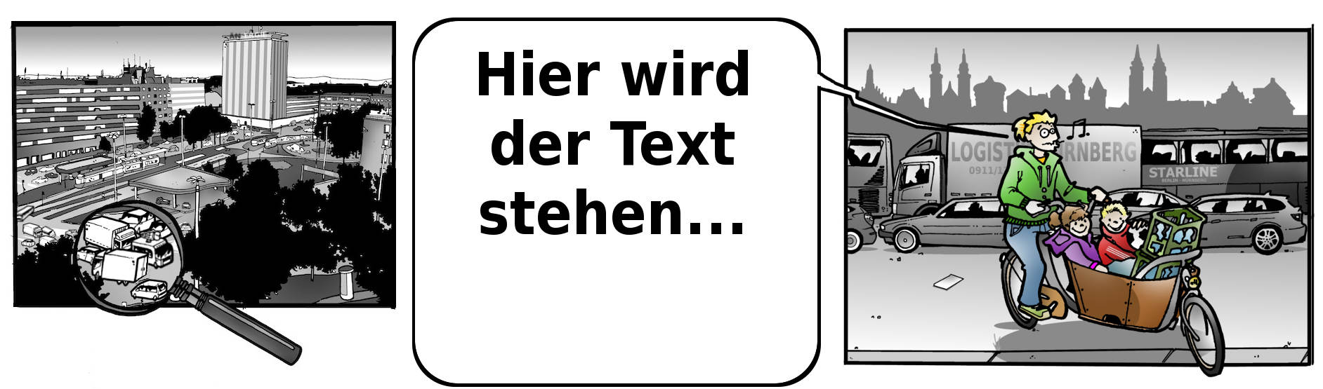 Überfüllte Straßen (dazu kommen nochn paar Autos mit in den Vordergrund) und in der Lupe sieht man, wie sich gemütlich ein Radfahrer durch den Verkehr schiebt. Die Lupe muss halt sein, denn sonst würde auf dieser minimalistischen Zeichnung kaum nen Radfahrer zu erkennen sein...