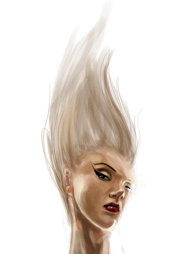 Mal zum zweitletzten Bild, das du gepostet hast (also, das mit der Frau), irgendetwas stimmt nicht mit dem Kopf: Er ist irgendwie zu gross und zu lang. Der Halsansatz stimmt auch nicht ganz und durch die Perspektive (so kommts mir vor) sollte man eigentlich viel weniger Haare sehen, bzw es wirkt, als könnte man leicht von oben herab auf ihre Haare gucken obwohl sie den Kopf ganz leicht zurück legt.