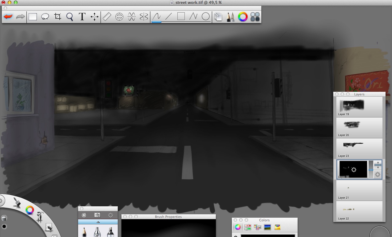 Was das Dunkel angeht: Wenn Du mit Schwarz drübergehst, dann wirkt das meist eher wie Nebel. Am besten würde es wohl tatsächlich mit dunklem Blau funktionieren, die Lichtkegel (Streulicht) dann mit rot-orange-gelb nach färben. Ich bin allerdings "analoger" Zeichner, mit dem Zeichnen am PC kenn' ich mich noch nicht aus. Auf dem Papier erziele ich mit Blau aber die besseren Ergebnisse als mit Schwarz/grau.