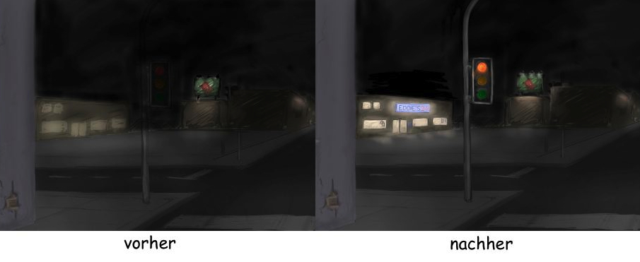 Ich versteh schon was du meinst auch mit den Lichtkegeln. Ich hab das auch alles schon so gemacht wie du sagst. Bei der Ampel weiss ich auch nicht was mich da geritten hat das ich da so viel aufhellen wollte, an den waenden sollte eigentlich kein licht von kommen. Es sieht halt auch nicht aus wie lichtkegel bzw. so ungleichmaessig weil ich da schon so viel rumexperimentiert hatte und es dann weich versuchen wollte, ich meine selbst bei dem linken dunklen fenster hab ich wegen der dunkelheit glaube ich 3 layer gemacht weil man ja nichts makieren kann und war eh schon so schwer. Ueber dem rechten fenster ist halt noch so eine leuchtreklame und ich denke sowas hat keinen wirklichen leuchtkegel, die streuen ja so schoen :P Die restlichen lampen hab ich halt gelassen weil ich erst vorne hinkriegen wollte aber es sieht alles so nebelig aus :pinch: