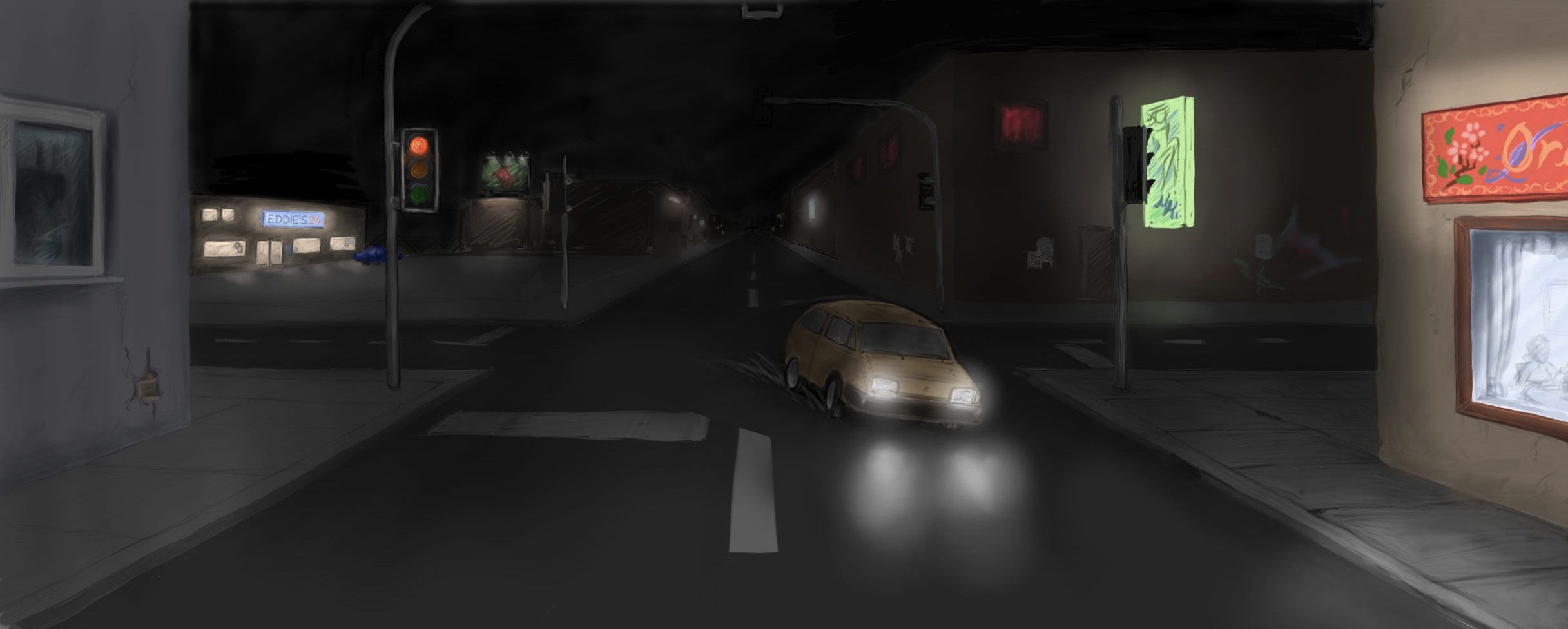 Da wollte ich grade auch was auf dein Bild schreiben und zack schmiert mir doch glatt mein GT ab XD immerhin hab ich es vorher gespeichert ^^° Die ganzen Lichter machen das ganze so richtig schön atmosphärisch muß ich sagen, grade weil du soviele kleine Details mit eingebracht hast wie z.B. die Lichter des Autos die man auf dem Asphalt sieht oder das Auto im Hintergrund das auf dem Parkplatz des Marktes steht. Ich find es auch sehr schön dynamisch wie das Auto so rasant um die Kurve rast, das läßt der Phantasie so richtig freien Lauf, man kann sich denken, dass das ja nicht auf Dauer gut gehen kann wie der Fahrer fährt. *g*