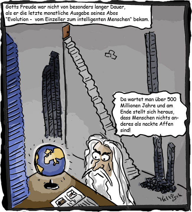 Hey, dass du den auch gestern nacht noch fertig bringst hätte ich nicht gedacht! Wie du Gott und die Kugel, das alles gezeichnet hat gefällt mir sehr gut. Bei der Sprechblase würde ich noch einen Pfeil machen! :)