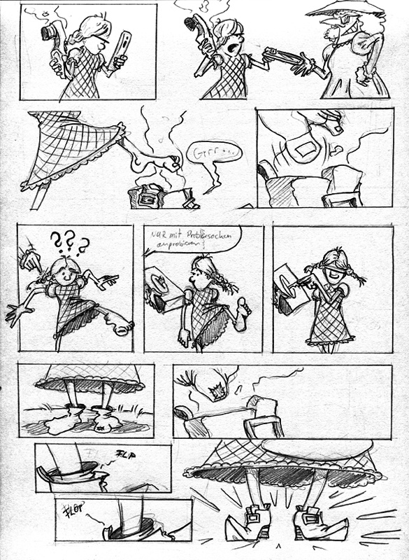 der stil gefällt mir sehr gut - ich finds auch krass wie viele panels du auf einer seite unterbringst. es liest (also sieht - bin gespannt was für text da noch kommt) sich flüssig, ist witzig und viel zu schnell vorbei. von mir aus behalte lieber den "rohen" stil bei und mach mehr seiten als zu viel nachbearbeitung. obwohl, wer weiß wie gut das erst wird wenn es richtig fertig (und farbig?!?) ist...