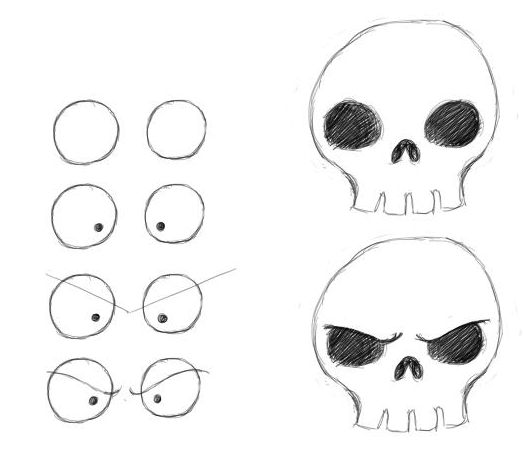 Es ist eigentlich ganz einfach. Wenn du einfach das erst als kreis hast musst du ja nur die augen, bzw die brauen in der mitte runter ziehen. Ich hab dir das links versucht darzustellen und beim schaedel halt auch beispielhaft versucht zu zeigen wie ich das meine.