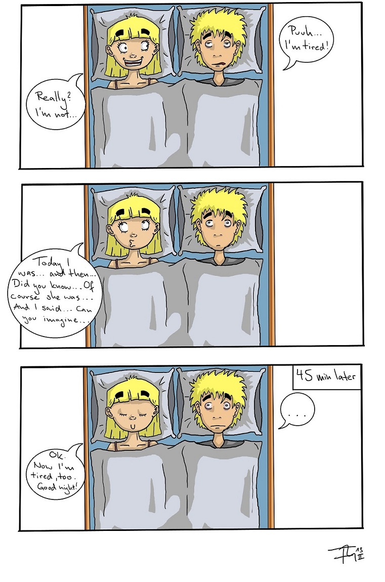 Nur ist die Sprechblasenverteilung im ersten Panel etwas verwirrend, ich hab zuerst gedacht, dass deine Freundin als erste redet. Ist aber nicht so schlimm...