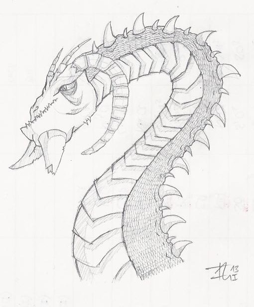 Die Schuppen stimmen bei der Stelle wo sich der Hals nach hinten wölbt bzw. die Schuppen nach innen persbektivisch nicht. Da müssten die Spitzen der Schuppen mehr zum Rand hin verlaufen oder ganz wegfallen, weil man die andere Seite ja nicht sehen sollte. Also quasi nur als schräge Linien ohne Spizte.