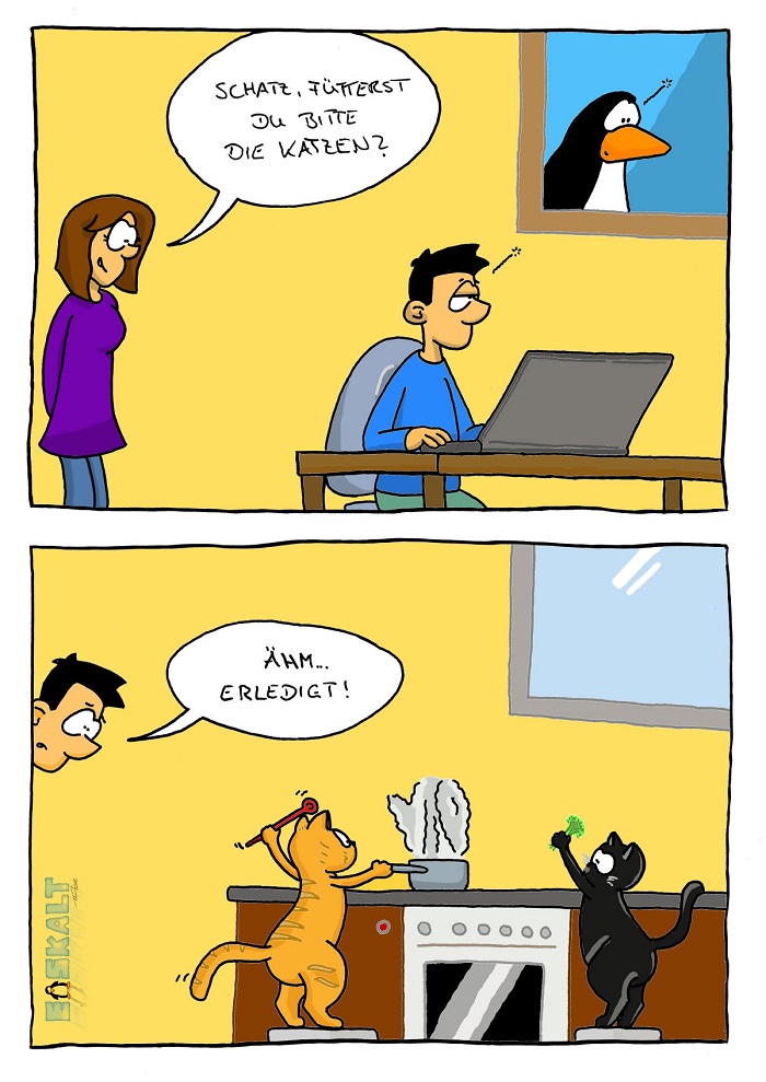 Insgesamt nicht schlecht. Aber ich würde Dir empfehlen, ein paar Dinge wegzulassen, die von dem Gag nur ablenken. Zum Beispiel den Pinguin. Schaut der eigentlich zum Fenster rein, oder ist der auf einem Bild? Im zweiten Panel ist an derselben Stelle ebenfalls ein Fenster oder ein Bild. Diese Fenster sind im Prinzip überflüssig, und sie vermitteln hier noch den irritierenden Eindruck (auf den ersten Blick), es handele sich um dasselbe Zimmer. Was hält übrigens die rechte Katze da Grünes in der Pfote? Kann ich leider nicht erkennen.
