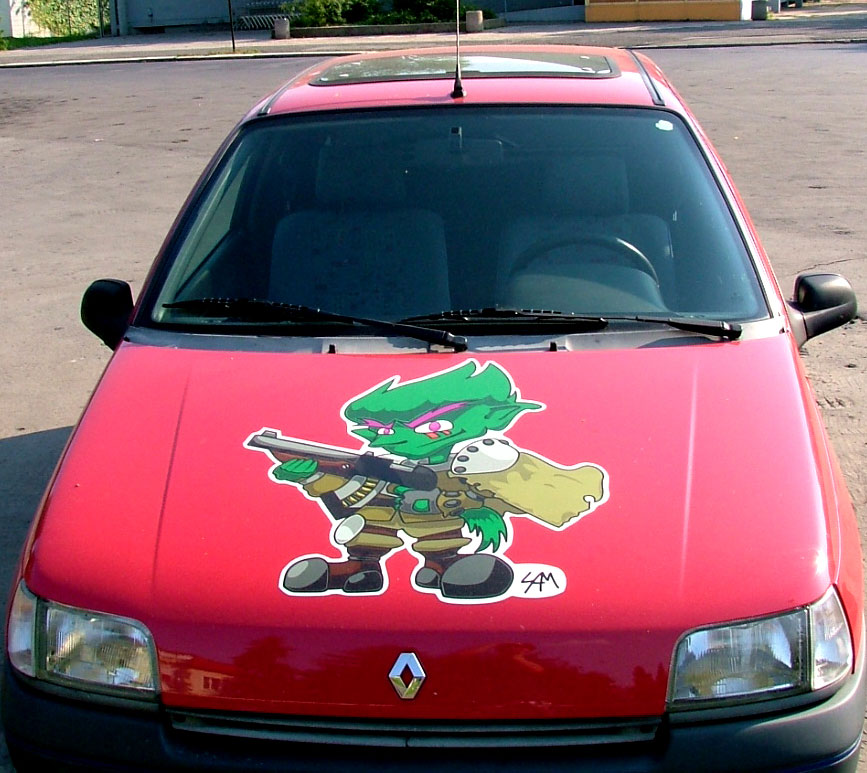 so wie versprochen hier jetzt n foto vom auto, ich find das rot beißt sich total mit dem grün des pics, aber naja, der kunde ist König!