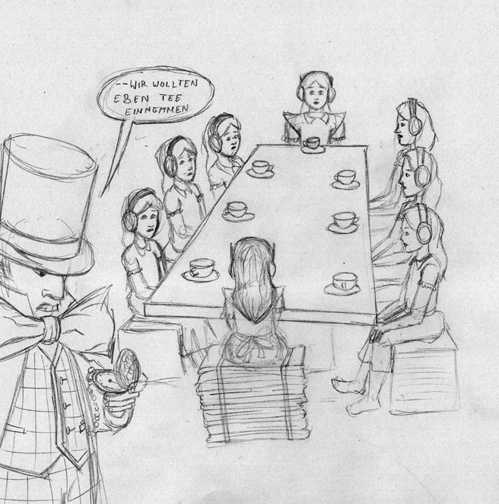 Also, der Mad Hatter sucht wieder mal seine Alice, das ist also sowas wie ein Casting...alle sind angeschlossen an irgendeine Steuerkonsole und sollen gleich trinken...der hatter führt selten Selbstgespräche, also redet er wahrscheinlich mit Batman der wiedermal in seine Teeparty geplatzt ist...Richtig?