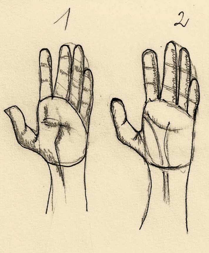 sieht beides gut aus. Hand 2 ist korrekt, der Mittelfinger ist länger als der Ringfinger.