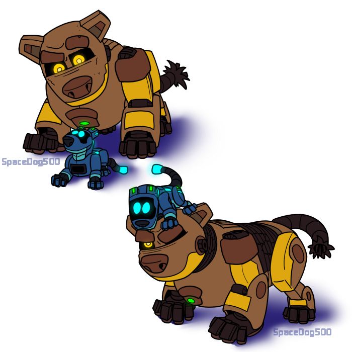 hm, ja Space is kleiner, aber nicht so klein wie hier. Das sind noch Bilder von ihm wo ich ihn als Welpen gezeichnet habe, weil das einmal wer requested hatte und mir hatts gefallen, also hab ich nochmal eins gemacht. Ich dachte es wäre doch lustig zu sehen wie Scrappy, der alte grießgrämige Klotz, sich um den kleinen, verspielten SpaceDog kümmern muss. :D