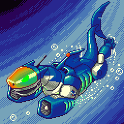 Ich hab hier Kyle als Wasserdrake aus meinem Kontestbild nochmal vollständig gezeichnen, einfach so. Flügel hat er keine, weil ich mag mechanische Flügel nicht so und außerdem hat er ja schon Düsen als Arme und die Rückenflosse ist auch noch im Weg. :P