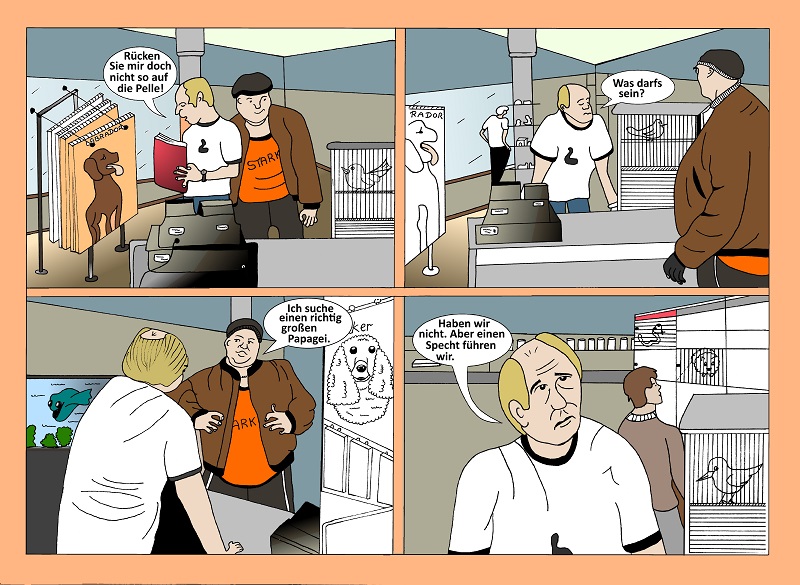 Peter, ich meine meine neue 2-seitige kleine Comic bestehend aus 8 Panels. Titel: In der Tierhandlung