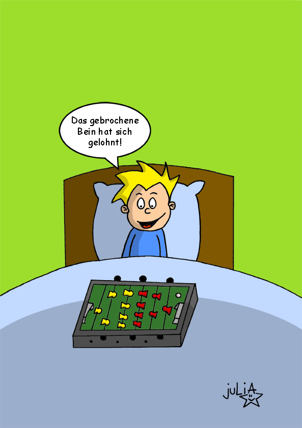 Deine Schattensetzung wirkt auch ziemlich unausgereift und verläuft immer nach dem selben Schema. Es werden immer die äußersten Kanten schattiert. Nur beim Kicker ist der Schatten nicht an der Seite sondern von vorne, was für mich keinen Sinn ergibt.