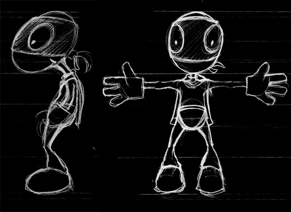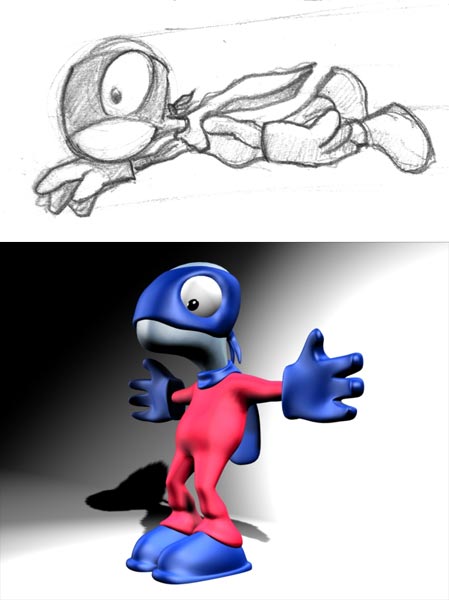 Ganz einfach du machst Dir eine Zeichnung von Deinem Character von vorne und von der Seite. Dann legst du die Seitenansicht als Vorlage auf eine Fläche im Fenster von Rechts und dasselbe machst du für das Fenster von vorne. Dann fängst du an Polygone zu zupfen das heisst du erstellst Flächen mit vier Punkten und bastelst daraus grob Deinen Character "low Polygon modeling". Anschließend legst du sowas wie Hyper Nurbs in Cinema auf Dein Objekt, es werden dann aus Deinen grob gestalteten Rechtecken ganz viele kleine gebastelt - du kannst angeben wie fein - und so wird Dein Objekt rund. Unten die Vorlage die ich für mein Superding genommen habe.