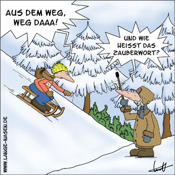 Ist wieder grandios gezeichnet. Ich finds auch recht witzig, mir kommt aber der Text von dem Schlittenfahrer ungünstig vor, da zweimal hintereinander das Wort "WEG" vorkommt. Ich glaube auch, es wären eigentlich zwei Sätze, die nicht nur durch ein Komma getrennt wären.