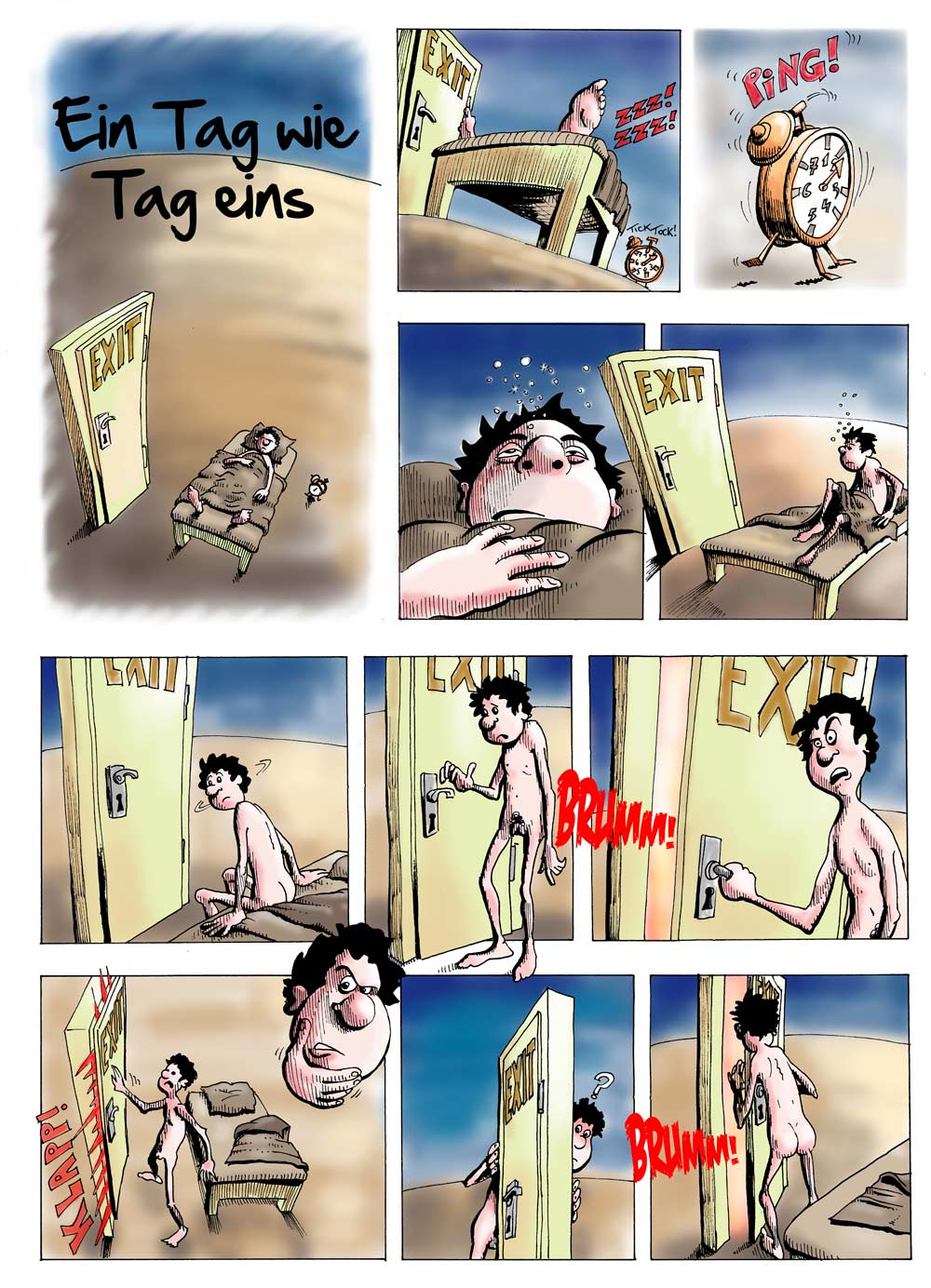 Beim letzten schön mit den Perspektiven gespielt. Die besten Panels finde ich das, wo er aufwacht (wobei er da etwas dicker aussieht als auf den anderen Bildern) und auf jeden Fall auch das, wo er vorm Büro steht. Obwohl Du die LKWs nur angedeutet hast, sieht man, wie er anderen Straßenseite steht als das Hochhaus.