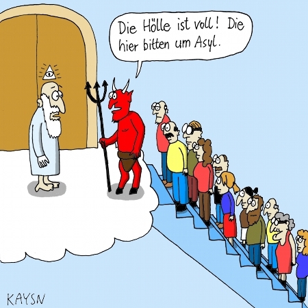 hab jetzt wirklich länger drüber nachgedacht, aber ich versteh den Witz einfach nicht... :S Gehts um Asylpolitik, um die ausufernde Bürokratie hier auf Erden, die selbst vor dem Himmel nicht halt macht bzw. auch nicht nach dem Tod aufhört... ?(
