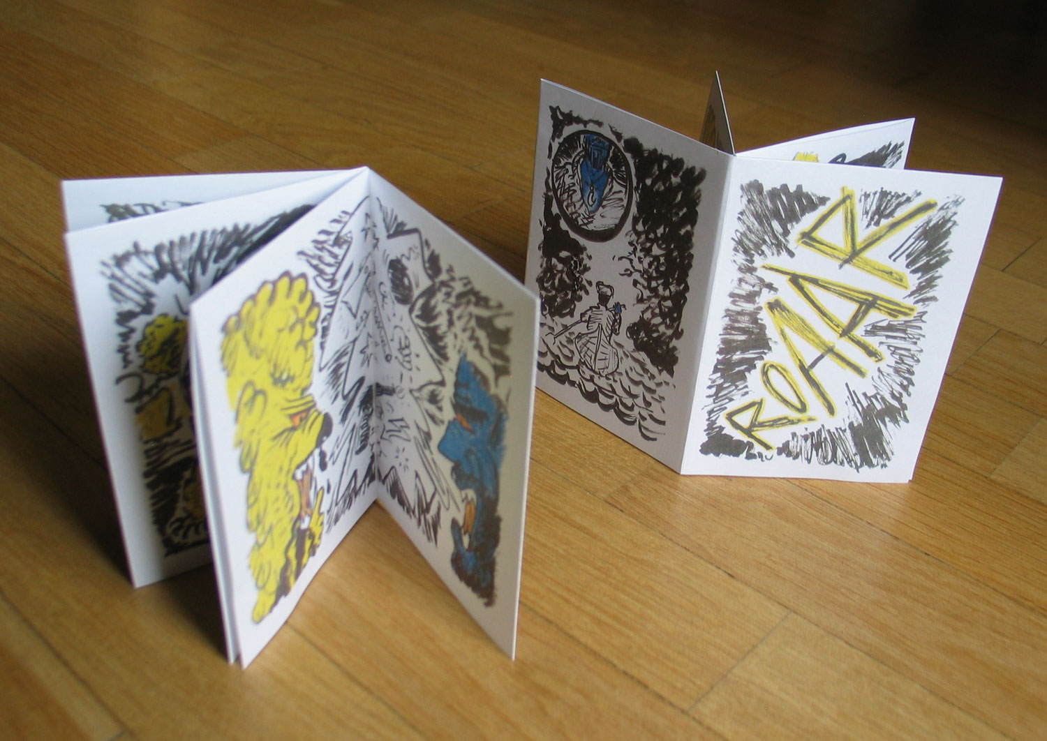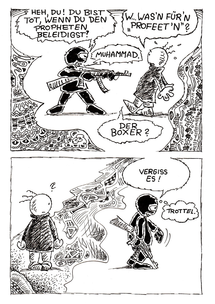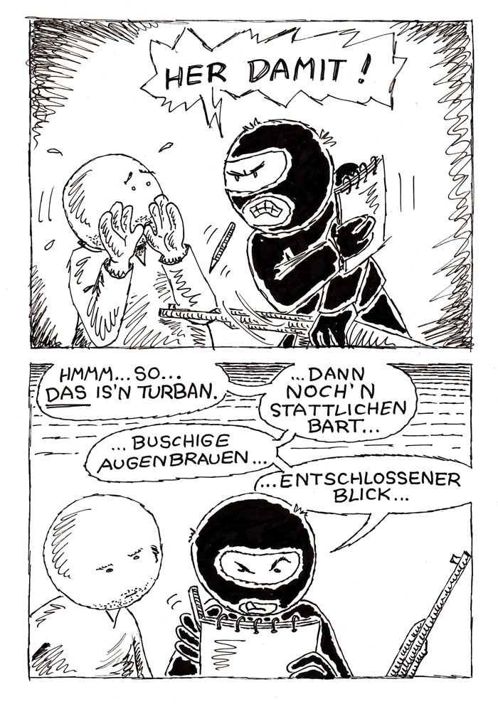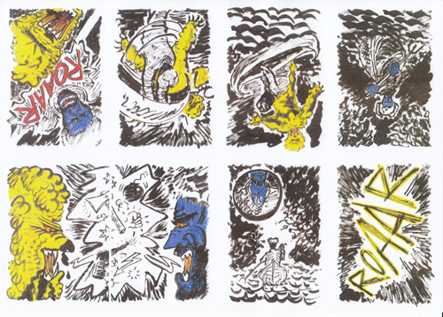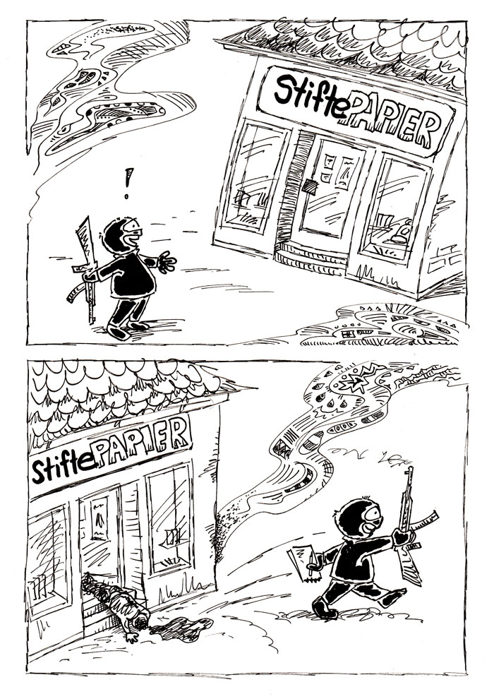 Muster, Schraffuren, Schnörkel, zackige Blasen, ZickZackLinien - wirkt sehr aggressiv und chaotisch. Das könnte "Gewalt" sein, die man dem Leser visuell begreifbar aufzuzeigen versucht.