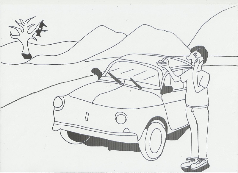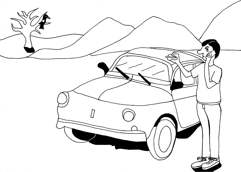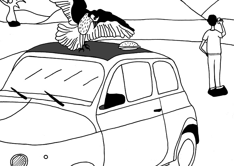 Hat da einer eine Autopanne in der Wüste, und ein Geier wartet schon?