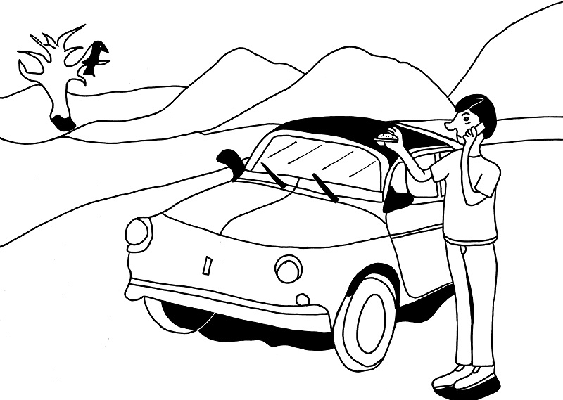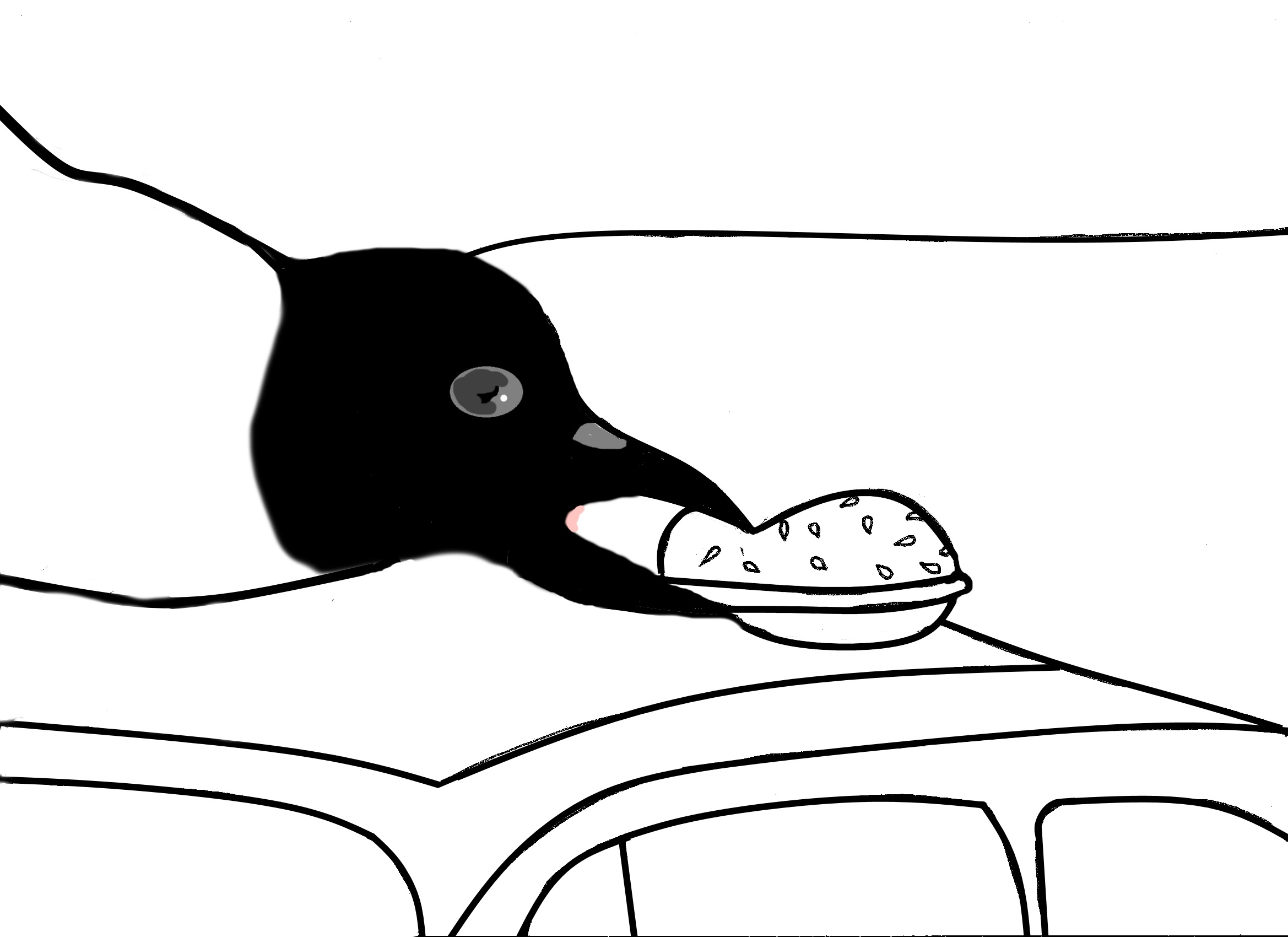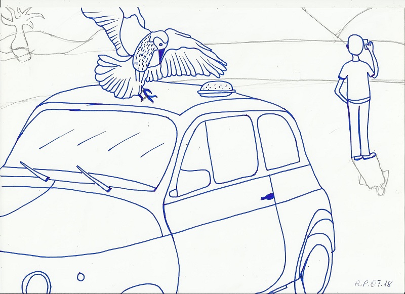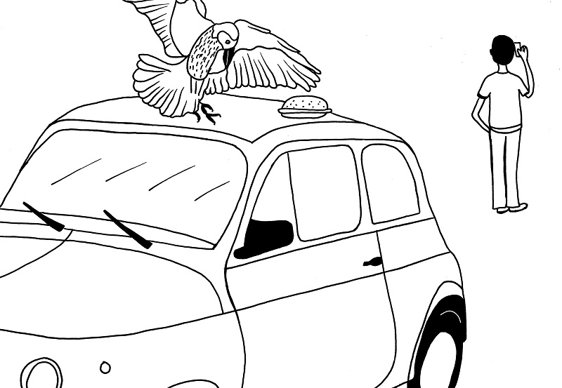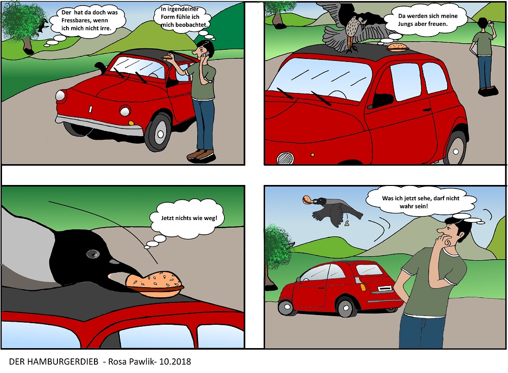 Hier müßte man gar nicht unbedingt zeigen, wie der Vogel das Brot in den Schnabel nimmt; man wüßte es auch, wenn Du im dritten Bild nur das leere Autodach zeigen würdest. Ob dieses Panel überflüssig ist oder vielleicht doch wichtig, hängt aber auch vom vierten Panel ab.