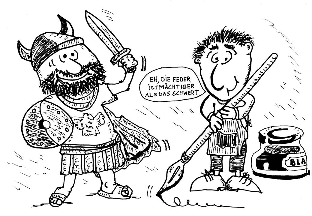 Solche Sprüche, Redewendungen, geflügelte Worte sind oft eine gute Witzvorlage, wenn sie allzu wörtlich genommen werden (und der Sinn dadurch verballhornt):Daß die Feder mächtiger ist als das Schwert, will ich als Journalist gern glauben. Dein Werk ist aber höchstens eine Illustration dieses Spruchs.